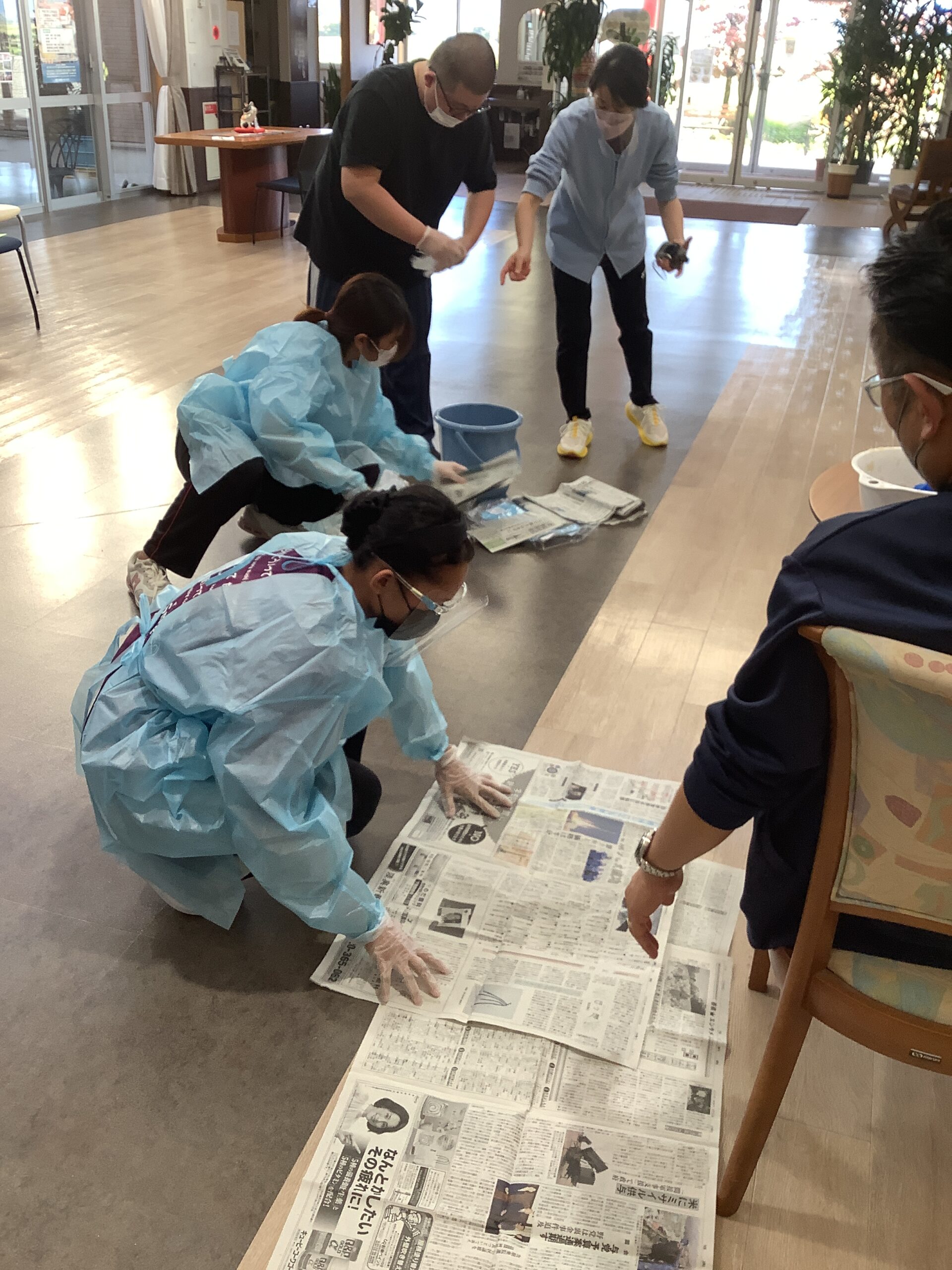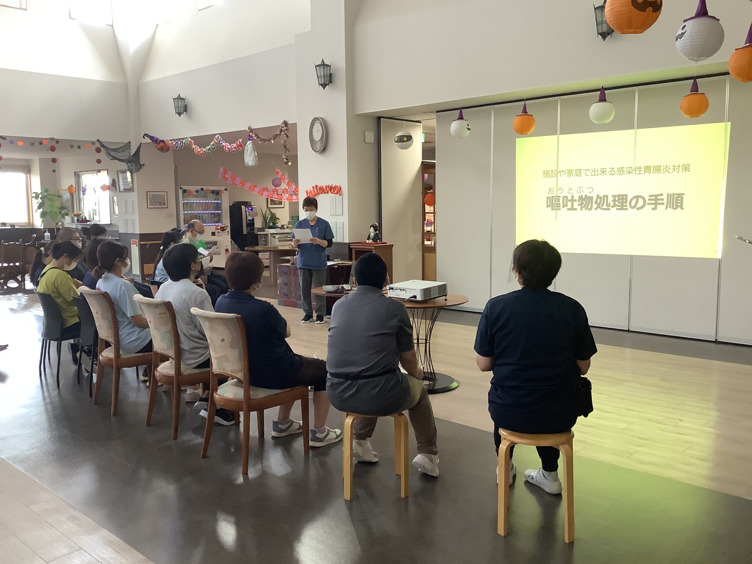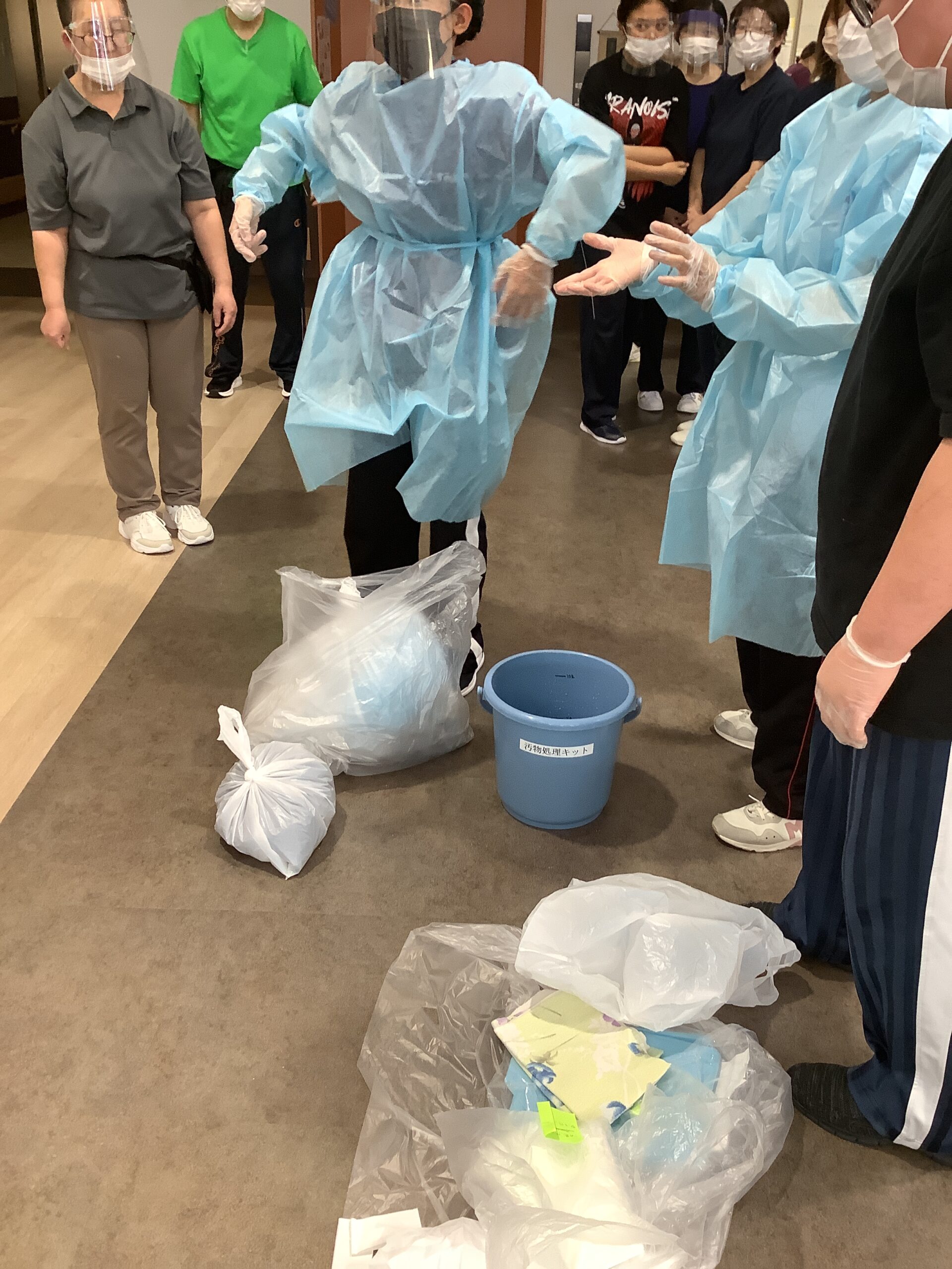 R7/11/7 10/24開催 感染症委員会主催 園内研修 嘔吐物処理の手順 2025.11.10すみれ特別養護老人ホーム Tweet Share Hatena Pocket RSS feedly Pin it 実践さながらに、嘔吐物の処理をしていきます。周りの職員もアドバイスをしながら動きの確認です。定期的な研修は職員のスキルアップにも非常に効果があります。 2回目の対応風景です、職員を変えながら全職員が統一した対策をとれるようにしていきます。 PPE(個人防護具の略で、施設ではガウンの事を指しています)の着脱練習です。ここで手順を間違えることで、自分自身が感染してしまうので重要な作業です。 当施設では次亜塩酸ナトリウムを薄めたものを使用し、汚染物の拡散及び所毒を行っています。 Tweet Share Hatena Pocket RSS feedly Pin it 投稿者: blogすみれ特別養護老人ホームすみれ特別養護老人ホーム, 嘔吐物処理の手順, 感染症委員会, 津軽地域, 青森県黒石市コメント: 0